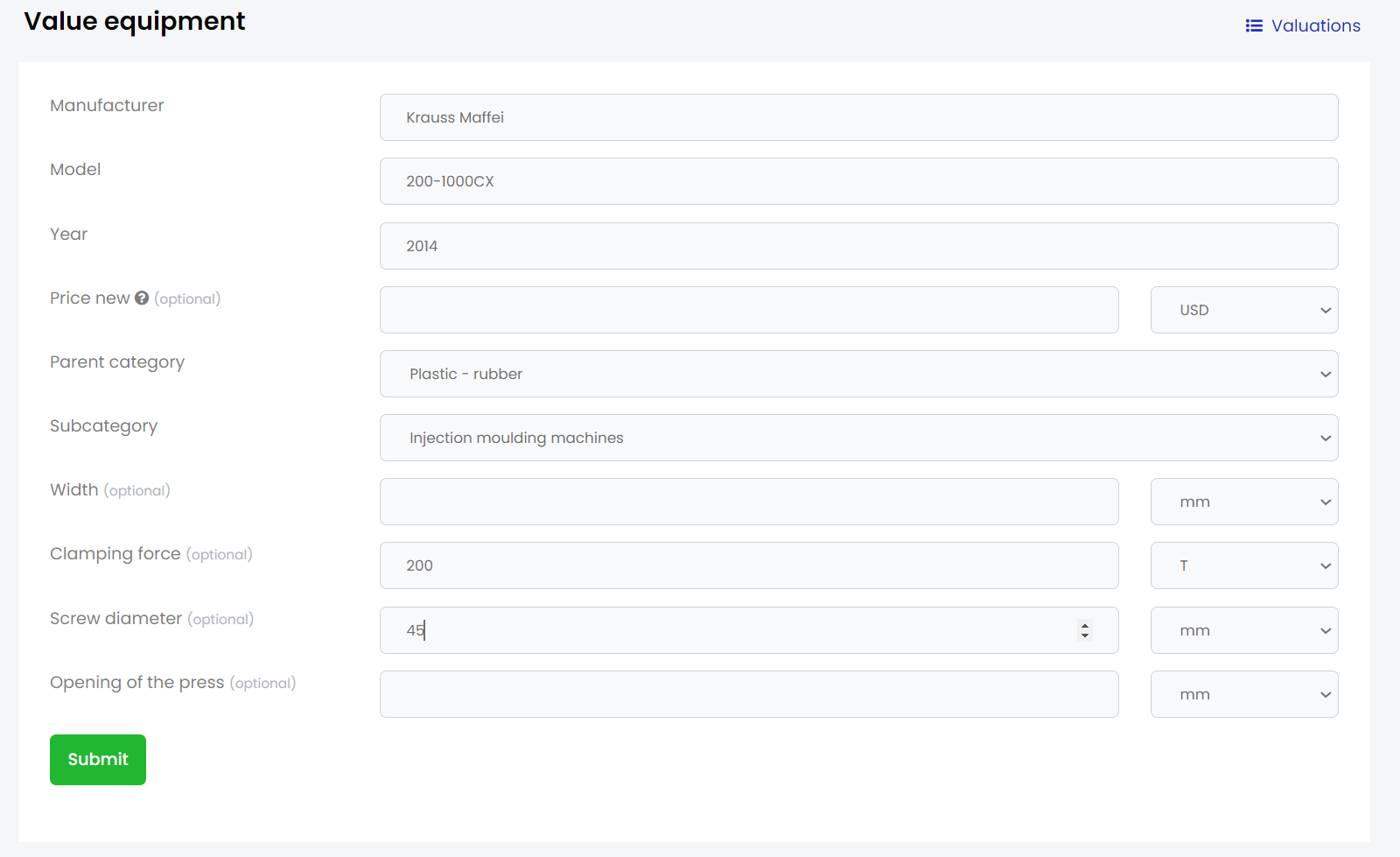 For this example we have chosen the Krauss Maffei 200-1000CX, manufactured in 2014. It is in the Category of Plastic - Rubber and the Subcategory Injection moulding machine and we have added the attributes of screw diameter and clamping force to help get a better valuation. The more information that can be input increases the confidence score of the valuation.
